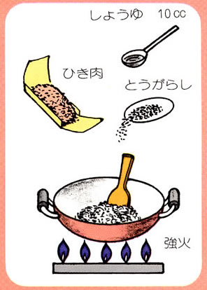 3.ひき肉、とうがらしを入れていため、ひき肉がぽろぽろにほぐれたらしょうゆを入れる。 |