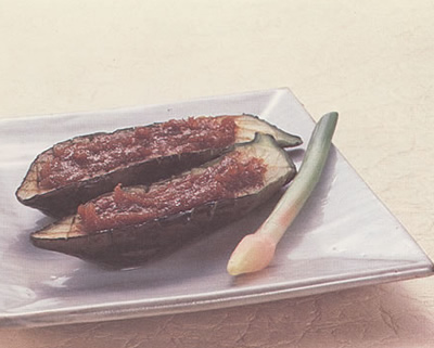 3.赤みそ、酒、さとうを入れて弱火にかけ、ねり合わせ、焼きあがったなすにかける。酢どりしょうがをそえる。 |