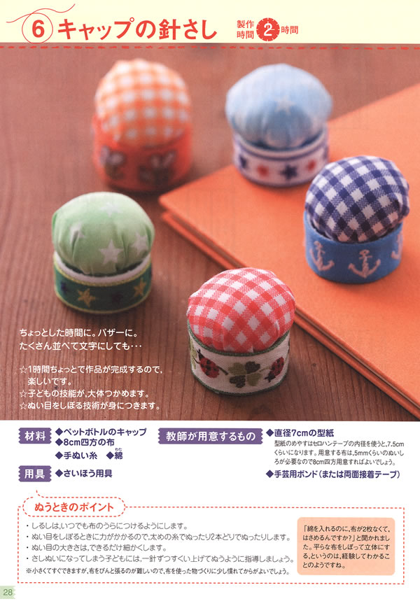 ペットボトルのキャップを使って,手のひらに入ってしまう針さしを作ります。 |